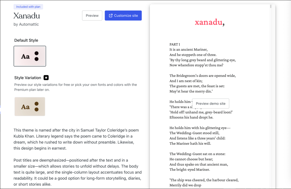 In an effort to learn quickly and stay scrappy, I am using an included-in-plan WordPress theme that seems especially fitting, Xanadu by Automatic. Since I cannot customize these pre-made styles without paying even more money to WordPress, I aim to create my own custom template after I have front-loaded more article writing and art creating, which is the focus of my Shanadu scheme. To hold me to this promise, here is a screenshot of my current theme (which should NOT be the theme of this blog by… next year).